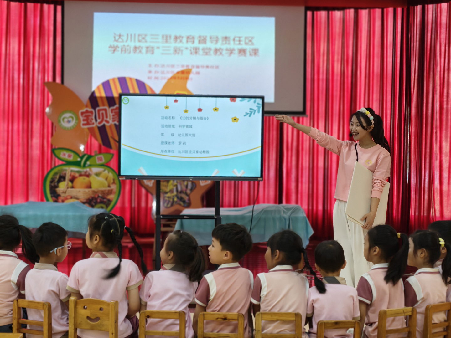 宝贝家幼稚园副园长罗莉的参赛课程为科学领域《10的分解与组成》,通过精心设计场景,以AI益智类游戏为载体,采用动画人物形象小恩10岁生日的角色为导入,调动幼儿的学习兴趣,引导幼儿动脑、动手,通过数学游戏,充分感知了数字之间的关系,课程流畅而灵动,课堂氛围轻松活跃,充分展示了生动活泼的教学风格、良好的专业素养与深厚的教学功底。经评委现场打分,罗莉副园长以总分第一的优异成绩获得一等奖,三里教育督导责任区主任张晓红向获奖者颁发了获奖证书,她还将代表三里片区参加达川区“三新”课堂教学活动决赛。