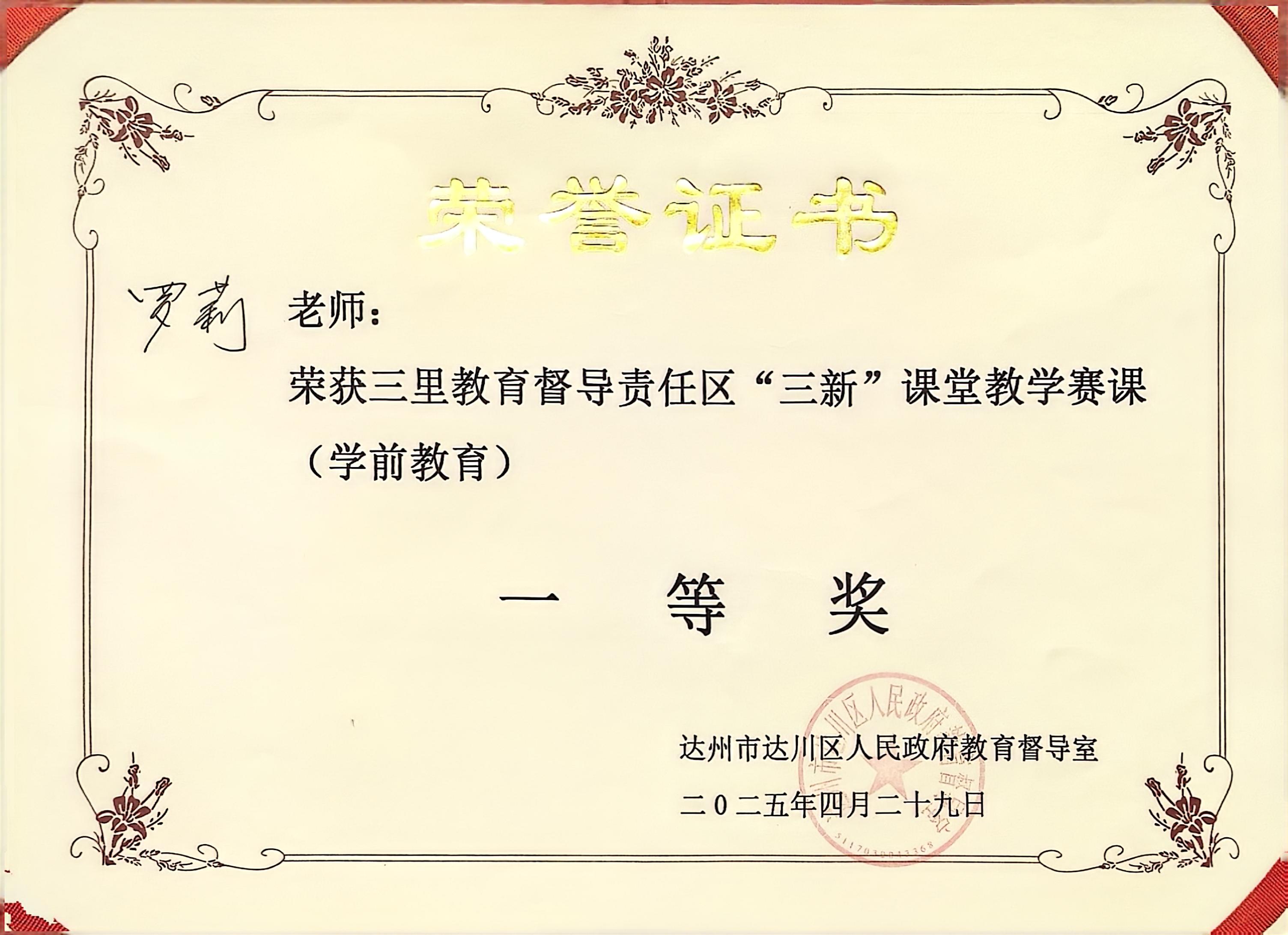 罗莉获达川区三里教育督导责任区学前教育“三新”课堂教学赛课活动一等奖