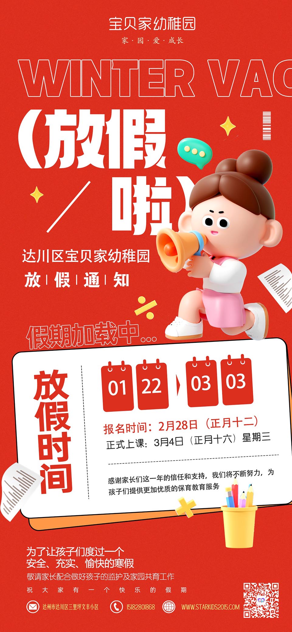 您好!时光荏苒,岁末将至,我们即将挥手告别蛇年,热情拥抱充满希望的马年,首先要向关心和支持我园工作的家长们表示衷心的感谢!感谢家长们的理解和配合!春节假期即将到来,为了让孩子们在家度过一个安全、充实、愉快的假期,现将宝贝家幼稚园2026年寒假放假通知及假期安全工作相关事项告知如下,敬请家长配合做好孩子的监护及家园共育工作。