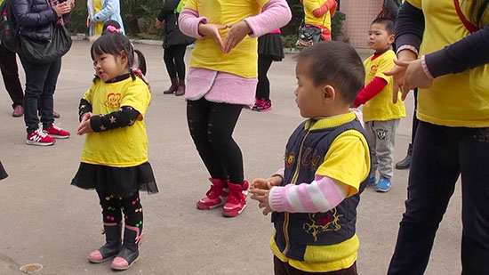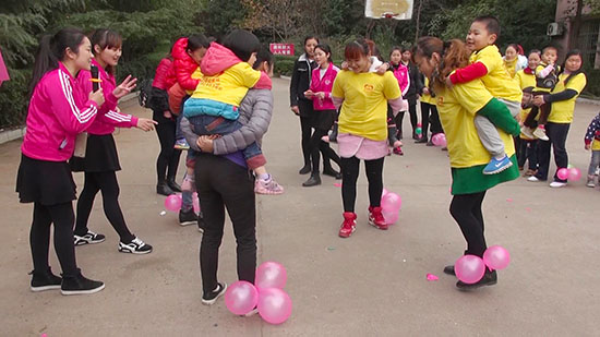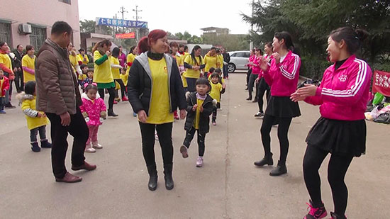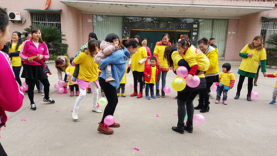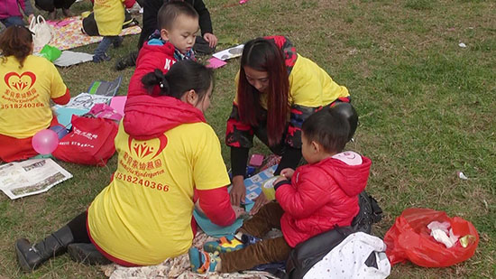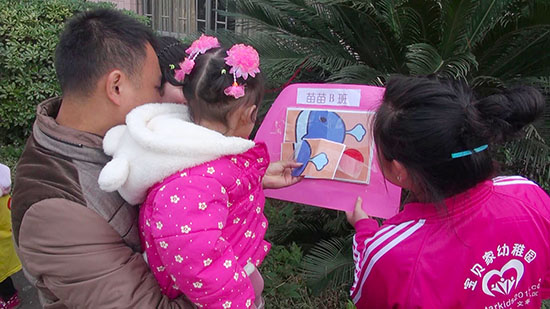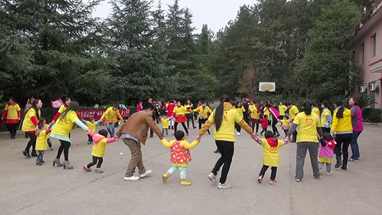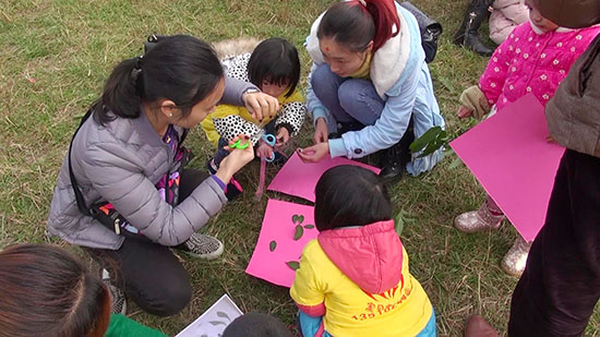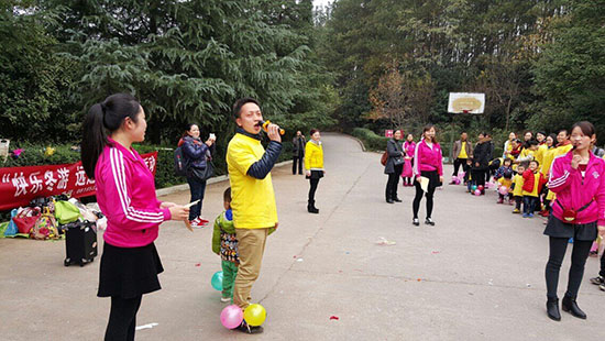 一路上,每位小朋友带着一小块拼图和一只写了自己名字的熟鸡蛋,你追我赶,谁也不甘落后,坚持爬向山顶,一路欢歌笑语,渴了,喝口水,累了,坐下来休息一下,没有一个孩子掉队。到达山顶仁和园山庄后,小朋友展示了带上山的“蛋宝宝”,又迅速拿出自己的拼图,每个班分别组合成一个图案。然后家长和小朋友一起进行了健身操《感恩的心》《小苹果》、亲子游戏《踩汽球》《大泡泡小泡泡》等活动,加油声、欢笑声此起彼伏。集体活动结束后,大家又一起来到草坪上,收集落叶,每个家庭共同完成了一幅贴纸画。大家一起拍照合影,孩子们一同玩耍,家长之间也愉快地攀谈、交流着。
