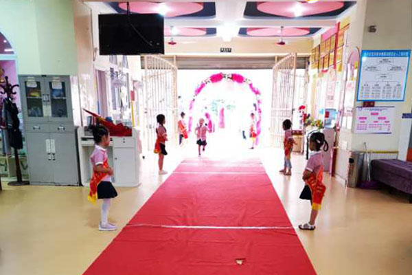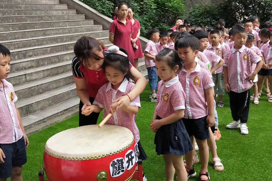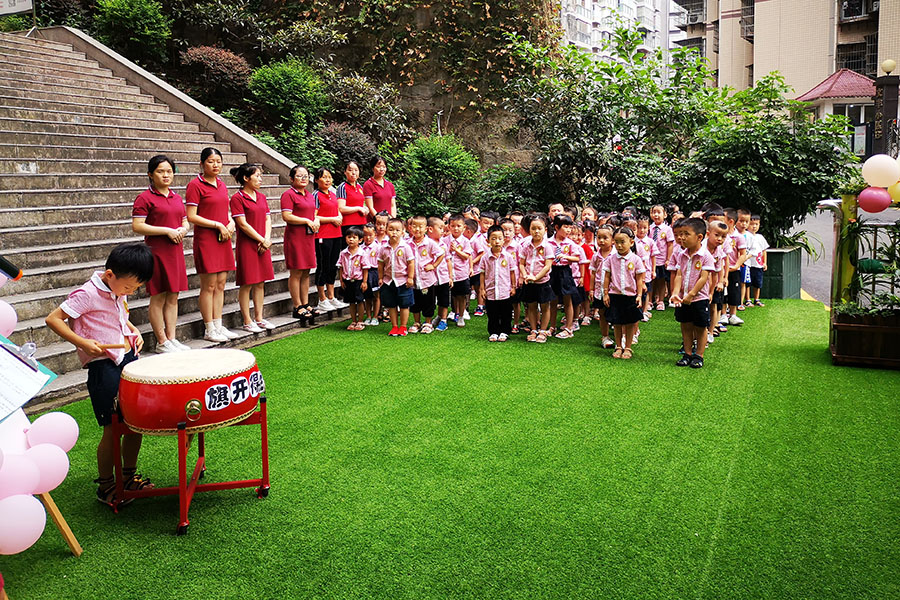 上午10时,全园师幼齐聚在幼儿园操场,小朋友们手持鼓槌,击鼓明志,园领导用朱砂笔在他们的额头上点上红痣,朱砂启智,开启智慧。随后,小旗手们将将鲜艳的五星红旗冉冉升起,全体师生面向国旗行注目礼。全体教职工进行了庄严的宣誓,承诺用爱去践行幼儿教师的神圣职责。随后,龙贵园长向班主任颁授了新班牌,她们带领小朋友穿过彩虹门,走过红地毯,携手迈进新的学期,将新班牌在教室门上悬挂好,正式开始新学年的学习生活。
