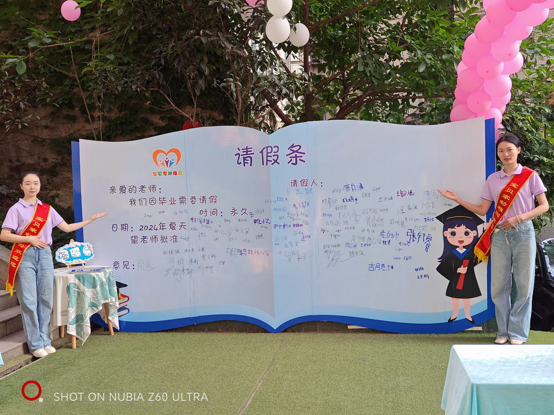 “亲爱的老师们:我们因毕业需要请假,时间:永久,望老师批准!”一块巨大的请假条立在幼儿园门前,果果班的孩子们郑重地在请假条上签上自己的名字。